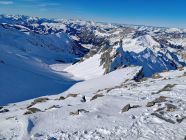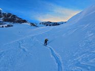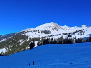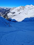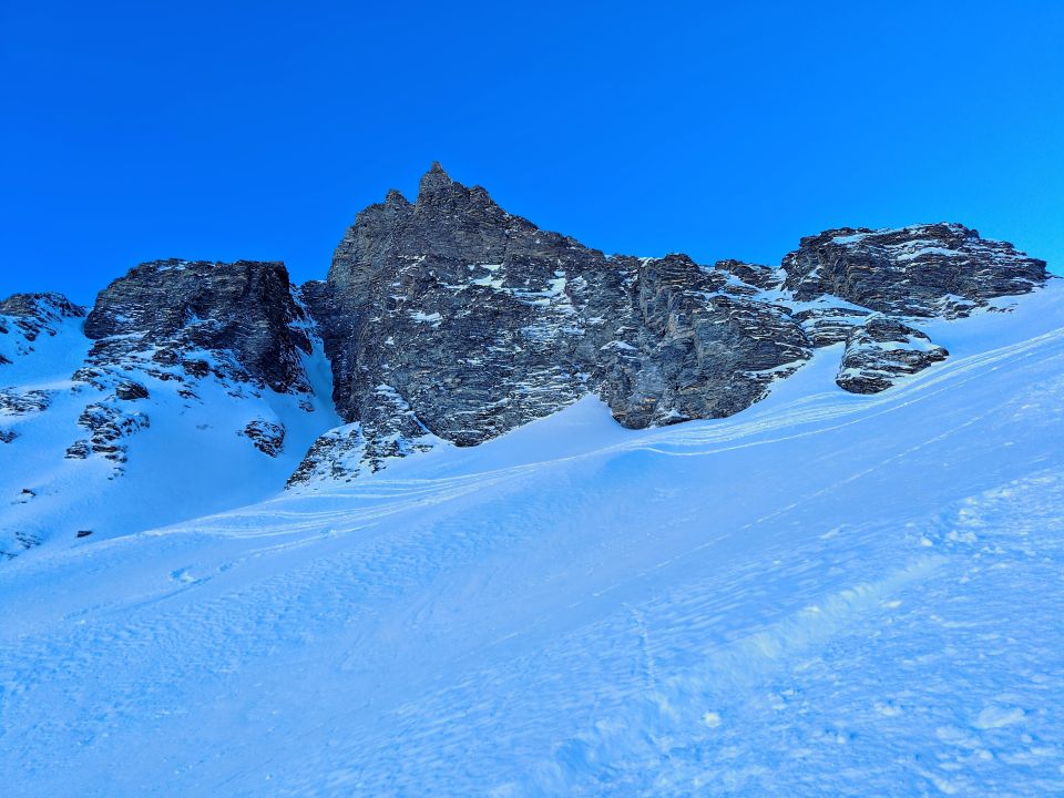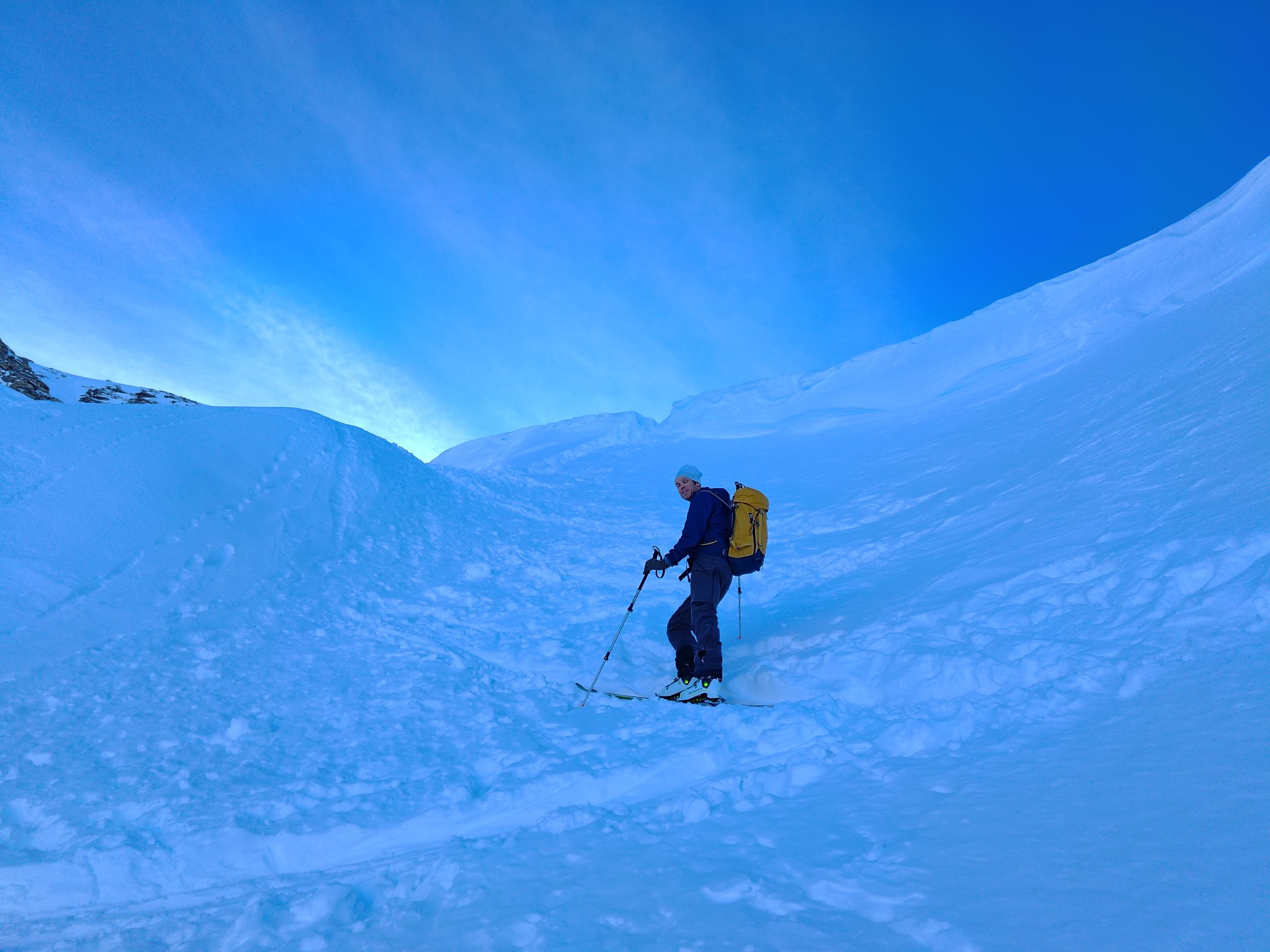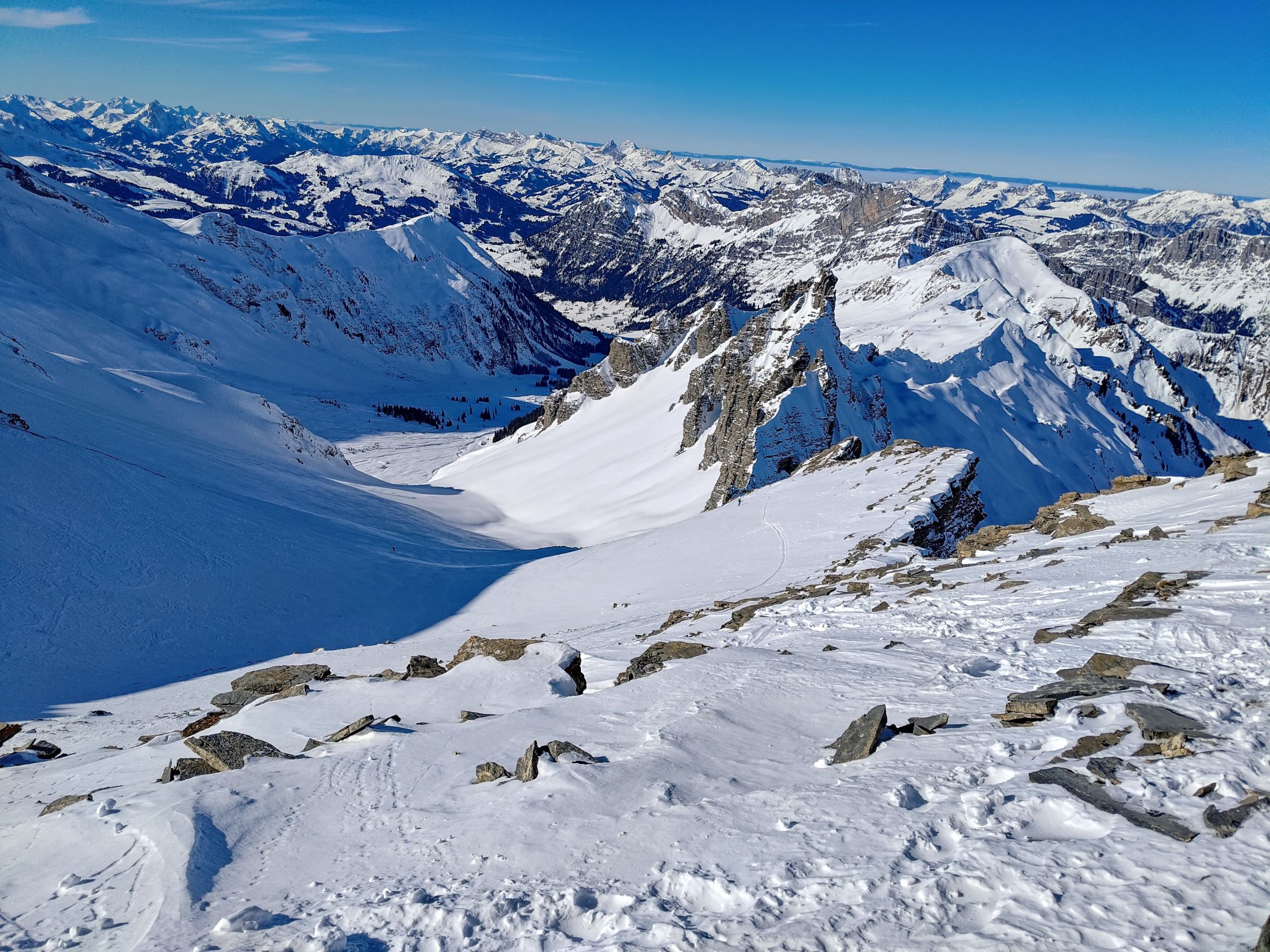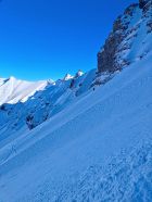 Oben windverpresst unten Pulver. Oberer Teil bekommt zur Zeit etwas Sonne, dort windverpresst/eisig bis sulzig je nach Tageszeit. Zwei Tourengeher sind noch zu Fuß zum Gsür rüber. Durch die Wechte am Sattel gibt es einen Fussaufstieg oberhalb des markanten Felsen im Steilhang (Foto) oder kurz danach einen Durchschlupf mit Ski aus dem dort flacheren Hangbereich (Foto), war aber ein Gewühl da der Schnee direkt unter der Wechte auch hier pulvrig ist und nachgibt. Besser noch weiter nach links in Aufstiegsrichtung aufsteigen, wo die Wechte noch nicht aufgebaut ist. Dort sind wir in der Abfahrt durch.
