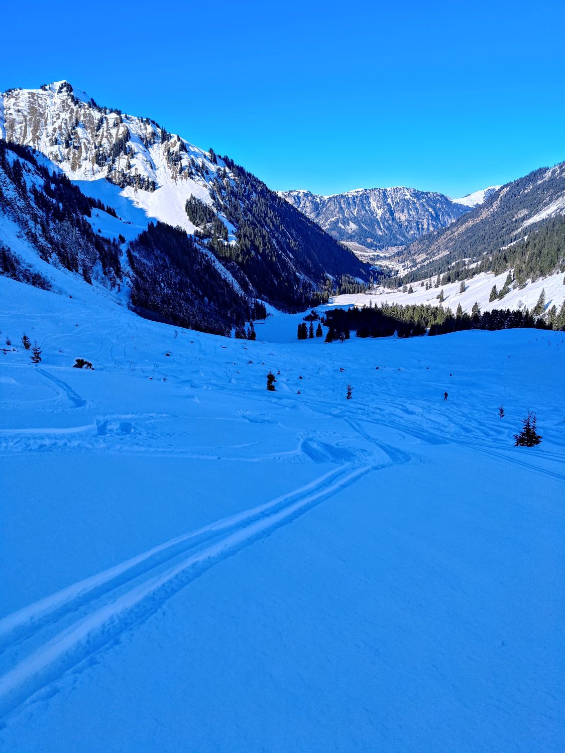 Ab unterhalb der Steilstufe fantastischer Pulver bis fast ganz runter zu den Häusern am Parkplatz.