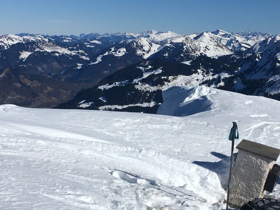 Bädle. Garnitza Alp Saluver Alp SW Hang auf Schulter und Gipfel, weiter zu Hohen Freschen. Meist gute Spur, in Abfahrt alles zu finden. In Bereich der bachtobel ca 15 Minuten Ski tragen.