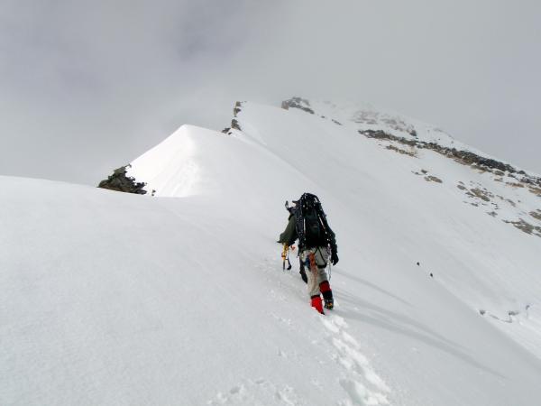 In der Nacht hat es nicht durchgefroren, darum sind wir auch schon auf dem Gletscher mit Schneeschuhen gestartet. Diese haben wir nur zur Überwindung des Bergschrunds nach dem Bruneggjoch kurz ausgezogen. Den Grat selbst haben wir dann natürlich mit Steigeisen begangen. Guter Trittschnee, fast ein wenig zu tief, aber wir konnten uns bei der Spurarbeit abwechseln, so kamen wir recht schnell voran. Die Kletterpassage (ca. 15 Meter) haben wir am Seil gesichert, allerdings sind Sicherungspunkte nur schwer und unzuverlässig anzubringen, der Fels ist extremst bröslig. Auch ein Stand ist schwer einzurichten. Der anschließende Schlussgrat (30 Meter) ist momentan messerscharf und total ausgesetzt. Beim Abstieg Nebel und Schneefall. Mit Karte und Kompass haben wir aber ohne Umweg den Normalweg übers Bishornjoch gefunden.