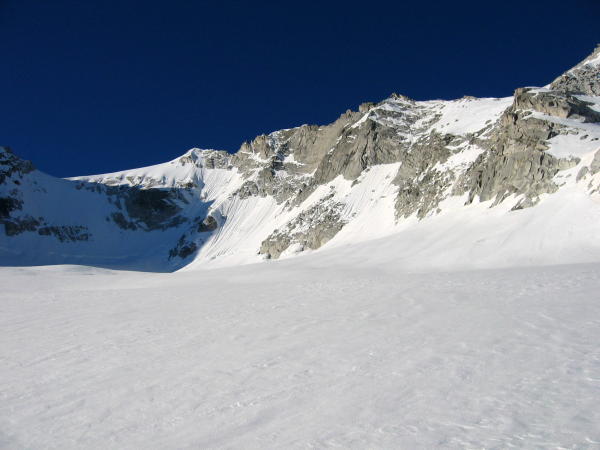 Nach einem trüben und nebelverhangenen Aufstieg, durchbrachen wir auf 2900m.ü.M. den Hochnebel. Auf dem Gletscher liegt ca. 10cm Neuschnee. In der eigentlichen Wand, das sahen wir jetzt liegt fast kein Schnee mehr. Deshalb entschieden wir uns in den Wandteil links der Felsen einzusteigen. Um so grösser war die Überraschung als wir schon ziemlich schnell in hüfttiefen Neuschnee steckten. Da dies auch bei zunehmender Steilheit der Wand nicht besser wurde, entschieden wir uns umzukehren.
