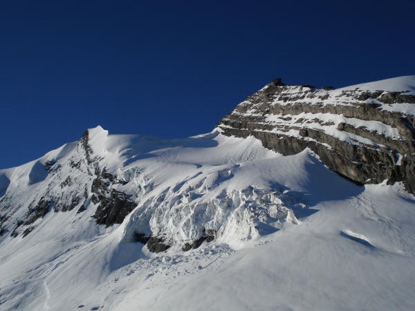 Gletscher perfekt eingeschneit und morgens hart. Die Querspalte/Eisbarriere auf ca. 3350m kann zur Zeit durch eine Rinne auf der rechten Seite (W) auf einer Rampe überwunden werden (s. Foto).