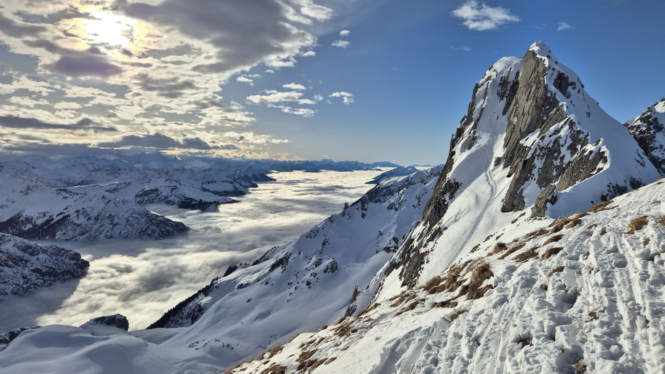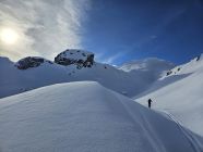 Durchweg Schnee von Landsteg ab. Beim Alpweg im Schandelstobel muss man nur an ein paar Wasserrinnen die Ski abschnallen. Weil wir auf der Biberacher Hütte übernachten wollen, machen wir vom Schadonapass den kleinen Umweg über die Hütte und lassen dort einen Teil unseres Gepäcks. Wir haben schönen Sonnenschein und herrliche Fernsicht, während unten im Großen Walsertal ein Nebelmeer wabert.