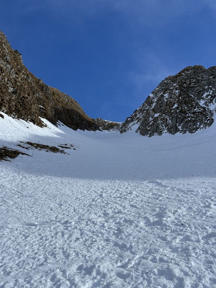 Momentan sind es genau 30m zum abseilen. Runterlassen und dann selber runterkraxeln geht auch. Im Couloir eigentlich sehr gute Verhältnisse, über schönen Pow, Presspulver und ein paar wenige harte Passagen alles gefunden. Unten raus bis zur Strasse sehr sehr schön zum fahren.