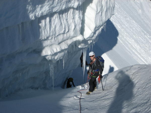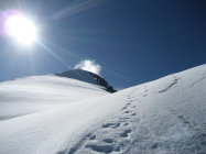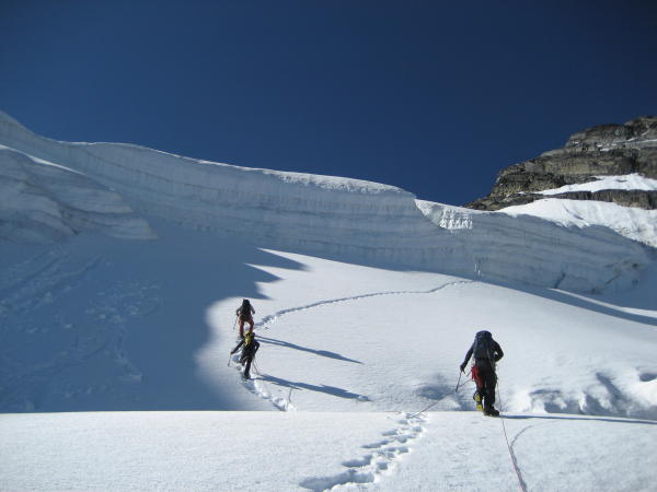 Noch einige Schneefelder zwischen den Moränen beim Aufstieg, diese und Schneeauflage auf dem unteren Teil des Gletschers auch schon beim Aufstieg sehr weich. Dadurch sehr anstrengend, im oberen Teil dann aber schönen, harten Firn angetroffen, super Verhältnisse! Teilweise heftige Felsstürze gehört und beobachtet - unbedingt auf dem richtigen Weg bleiben! Die kritische Spaltenzone (Abbruch) im oberen Teil kann ganz einfach durch eine schöne Rampe im rechten Teil passiert werden (Detailinformationen in der Hütte)