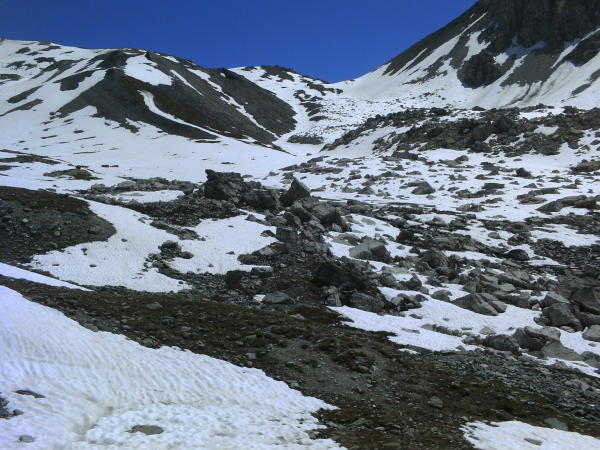 noch seeehr viele Schneefelder gilt es zu überqueren. flache Schneefelder tragen praktisch gar nicht mehr. Steilere Schneefelder tragen teilweise und zum runterlaufen ist es eigentlich auch super, weil ma fast "skaten" kann :)