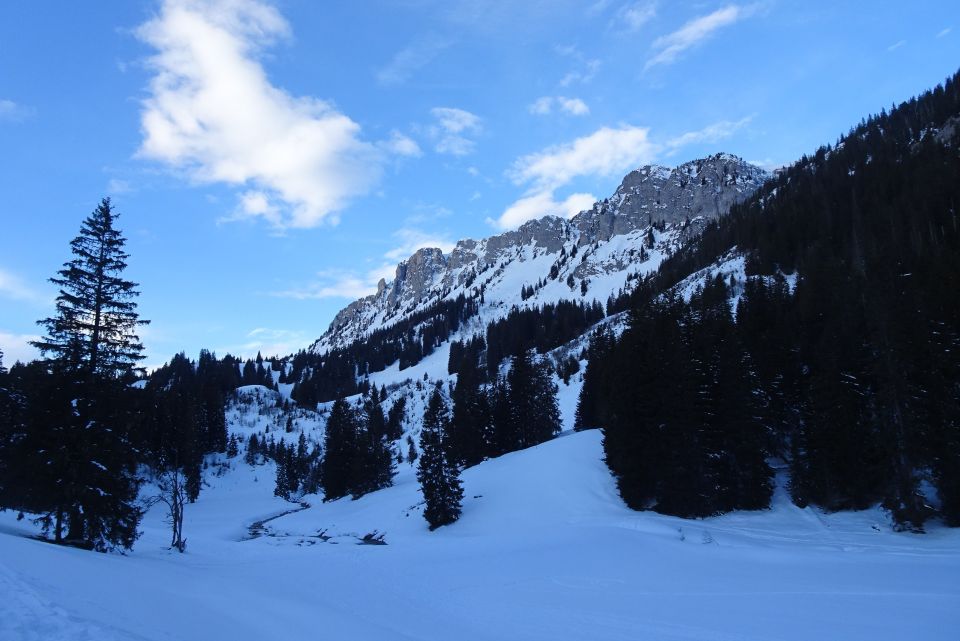 Strasse ab Parkplatz top eingeschneit und hart gepresst, das übersteht auch allfällige Föhnattacken. Das Gebiet ist eigentlich ganz gut eingeschneit, aber stark zerfahren, vielerorts pistenartig, trotzdem findet man stellenweise noch Pulver. Ausnahmen: Die Südaufstiege zum Turnen und Pfaffen sind nicht mehr machbar. Richtung Meniggrat ist die Schneesituation zuunterst etwas dürftig, aber machbar.