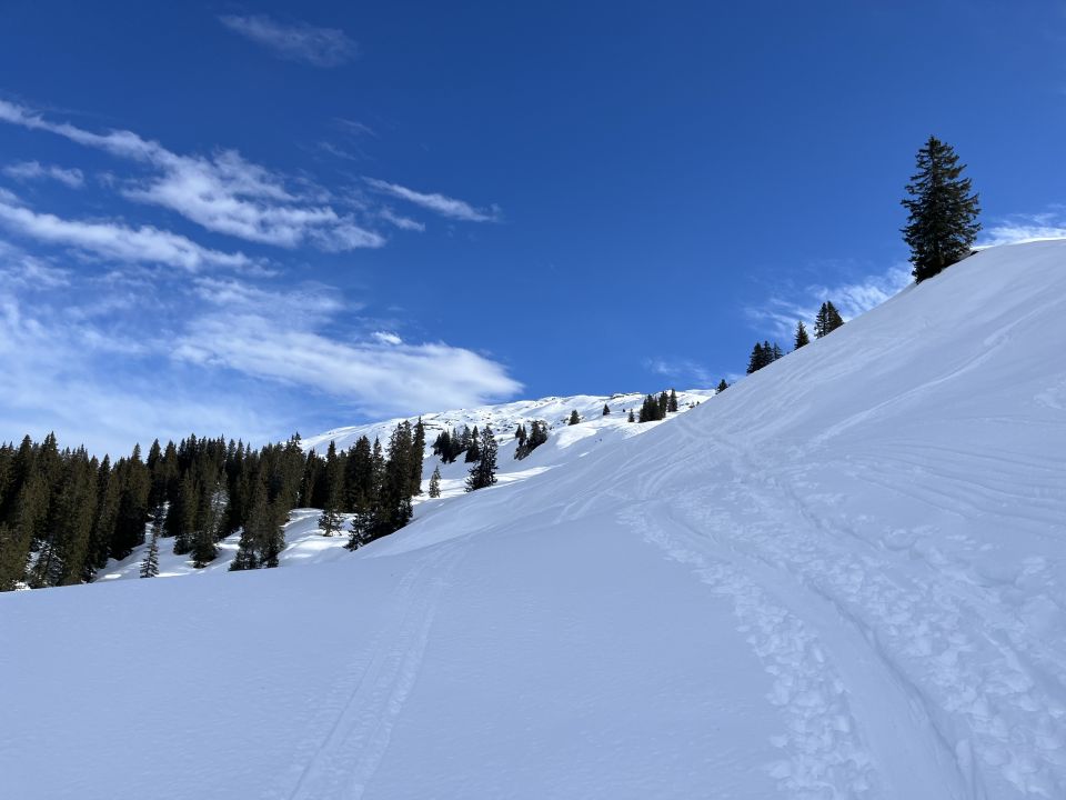 Am Morgen tragende Schneedecke. Oben noch Pulverschneeverhältnisse (Hänge sind einfach ziemlich zerfahren) und ab dem Mittag vor allem unten tendenziell klebriger und nasser Schnee.