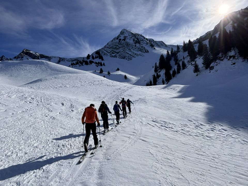 Geschlossene Schneedecke ab Parkplatz Schönisei. Aufstieg bis Abzweigung zur Allgäuw-Licka problemlos auf guter Spur. Im Steilhang oben sind dann Harscheisen für die vielen Spitzkehren hilfreich, da abgeblasen und hart. Ab Skidepot dann wenig Schnee mit z.T. etwas eisigen Stellen. Auf dem Gipfel windstill. Abfahrt entlang der Aufstiegsspur. Ganz oben etwas ruppig, da hart mit Windgangeln. Dann Presspulver, der nicht immer tragend ist. Weiter unten dann Schnee schön aufgesulzt und gut zu fahren.