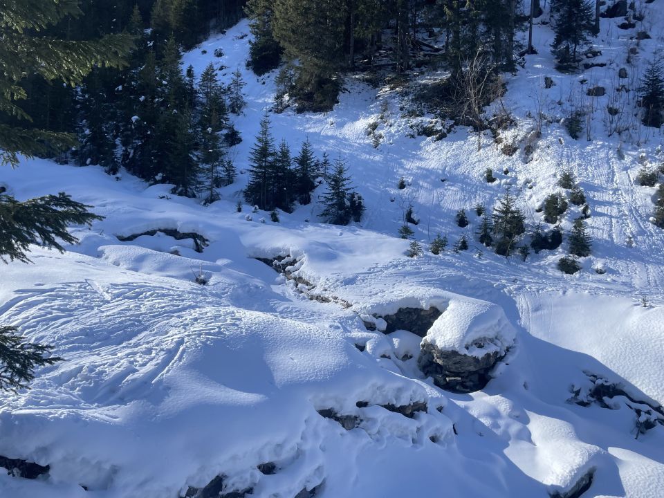 Schnee ab Fieldrich. Abkürzung durch Wald noch mit Schnee. Am Gipfelhang ist die Schneetiefe bescheiden, es schauen viele Steine raus oder lauern unter dem aufgeweichten Schnee. Heute sind fast alle über die östliche Abfahrtsvariante abgefahren um im Pulver zu bleiben, dort schon recht verspurt. Wir sind die westliche Variante gefahren, zwischen 2400 und 2200 m noch guten Pulver gefunden, darunter Sulz, der um 14.00 teils schon recht weich war. In der Fläche wieder Pulver und ab Almweg pistenartig bis Fieldrich.