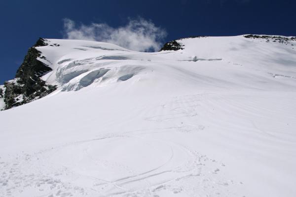 In der Abfahrt an steilen Stellen kleine Nassschneerutsche auf einer älteren Schneeschicht.