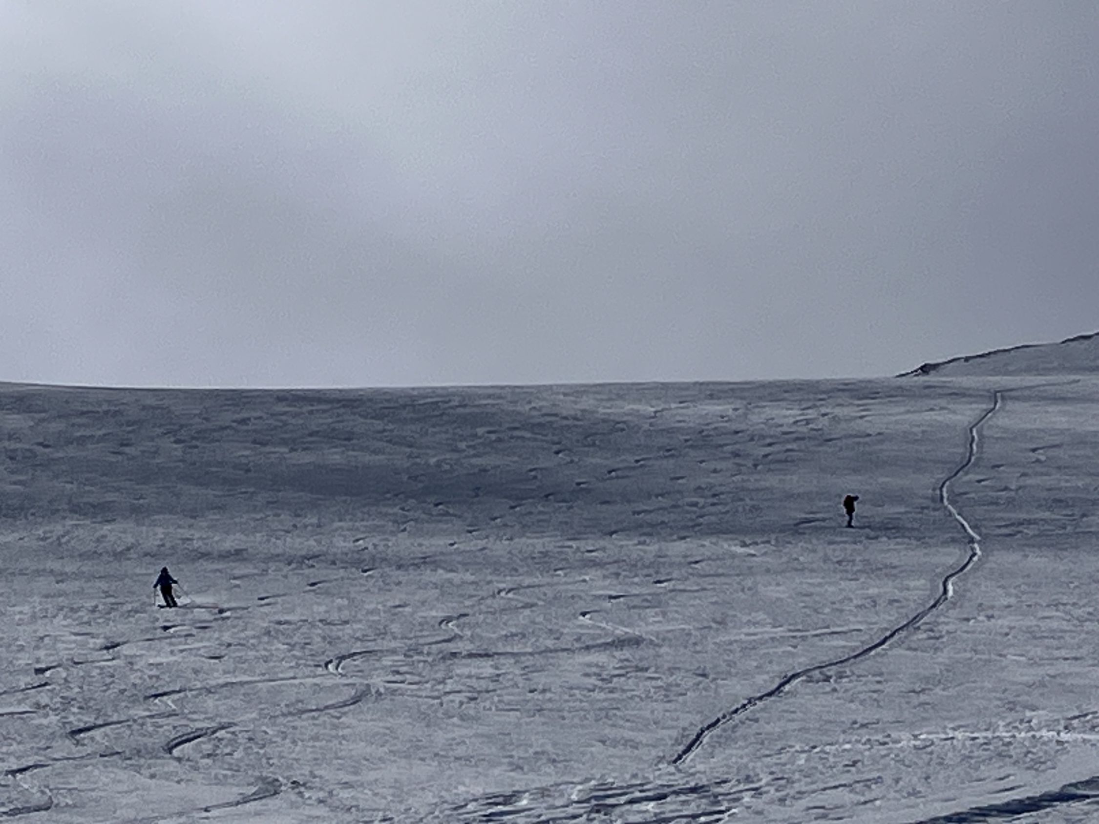 Abfahrt dann wie Aufstieg. Vom Iffigsee auf die Iffighore. Abfahrt von der Iffighore nach Hubelmatte. Vollständige Schneedecke bis zum Parkplatz. Im Allgemeinen keine lohnende Abfahrt. Oberhalb von 1700m hart und stark windgepresster/windverformter Schnee. Unterhalb von 1700m Pulverschnee im Wald, aber viele Spuren.
