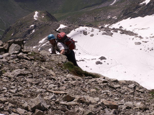 Das oben beschriebene Couloir ist derzeit noch schneegefüllt (Steilheit bis ca. 45 Grad). Ob man dies als günstig oder ungünstig ansieht, bleibt Geschmacksache. Der Rest der Route ist weitestgehend schneefrei. Es müssen derzeit aber immer noch zwei oder drei besonders steile und über exponiertes Gelände führende Schneefelder gequert werden, die aber seit heute gespurt sind ;-)! Der Schneeklotz in der ersten Scharte lässt sich sowohl über- als auch unterhalb umgehen.
