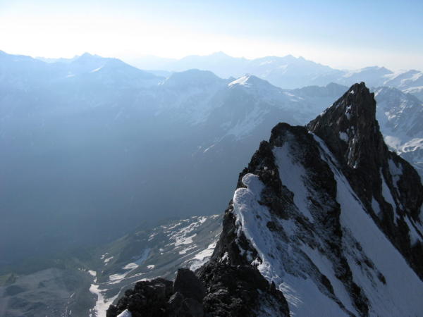 Perfekte Verhältnisse. Dementsprechend in 4.5h ab Hintergrathütte (Start um 3.30 Uhr) bis auf Gipfel über trockene Felsen und gut eingeschneite Schneefelder ohne Steigeisen geklettert. Abstieg über Gletscher bereits um 9 Uhr relativ weich. Ein, zwei heikle Spalten sind zu queren, ist jedoch noch gut machbar. Noch relativ wenige Leute im Gebiet (4 Seilschaften am Hintergrat, einige mehr auf der Normalroute unterwegs).