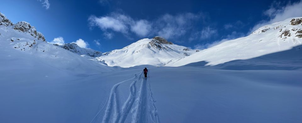 Wir folgten einer Spur, von heute. Hangneigung nie >30°. Unten ein längeres Flachstück im Valle del Monte, als etwas Schieben in der Abfahrt.
