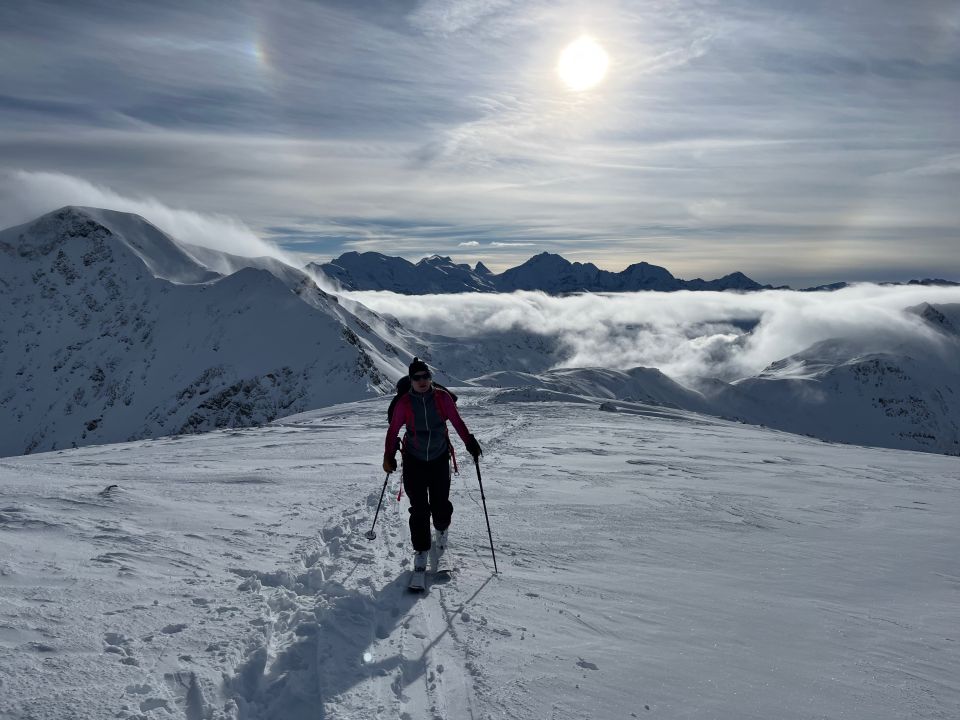Genug Schnee wechselnder Konsistenz. Am Kamm verblasen, Gipfel aber ohne Steinkontakt erreichbar.