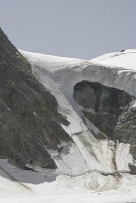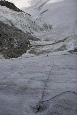 Wir haben den Schrund ganz links überwunden, sind dann nach rechts in die Mitte des Stromes gequert und dort geblieben. Früh sein lohnt sich sehr: bereits um halb sieben donnerten die Steine auf beiden Seiten hinunter. Ausser dem Anfang liess sich die ganze Wand gut schrauben: Um allerdings nicht zu lange darin zu verweilen, empfiehlt es sich, mit Tiblocs synchron zu klettern.