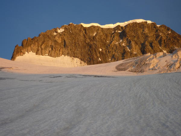 Sehr gute Verhältnisse, Gletscher unten blank, oben weicher Schnee. Am Gipfelfirngrat erste blanke Stellen.
