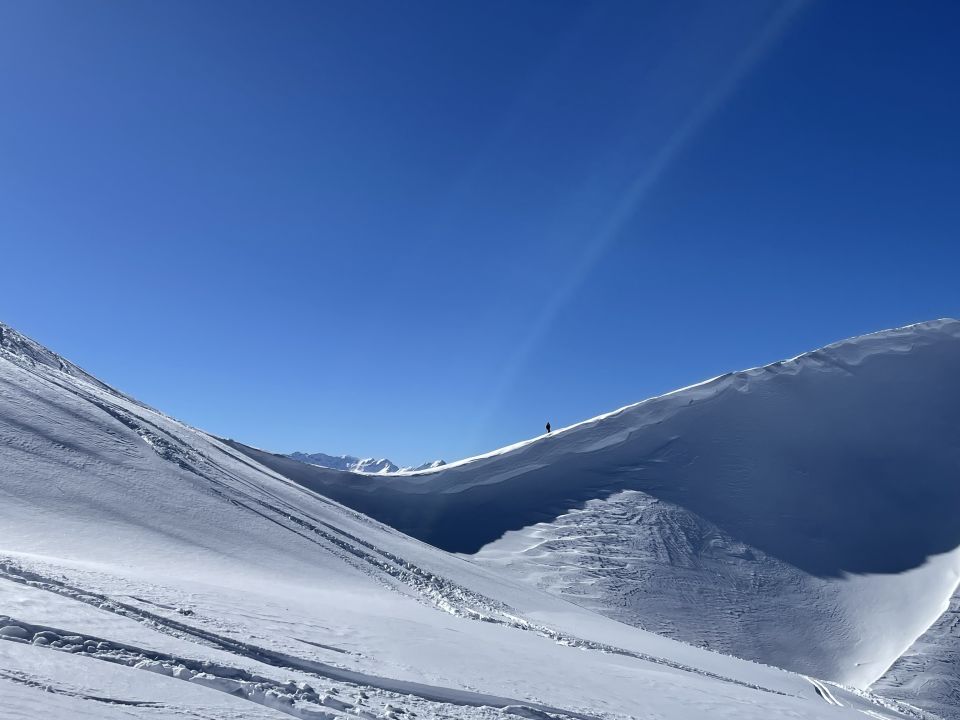 Pulver, Sonne, Bulletin orange: Rauflihorn. Top. Hundertschaft am Berg.