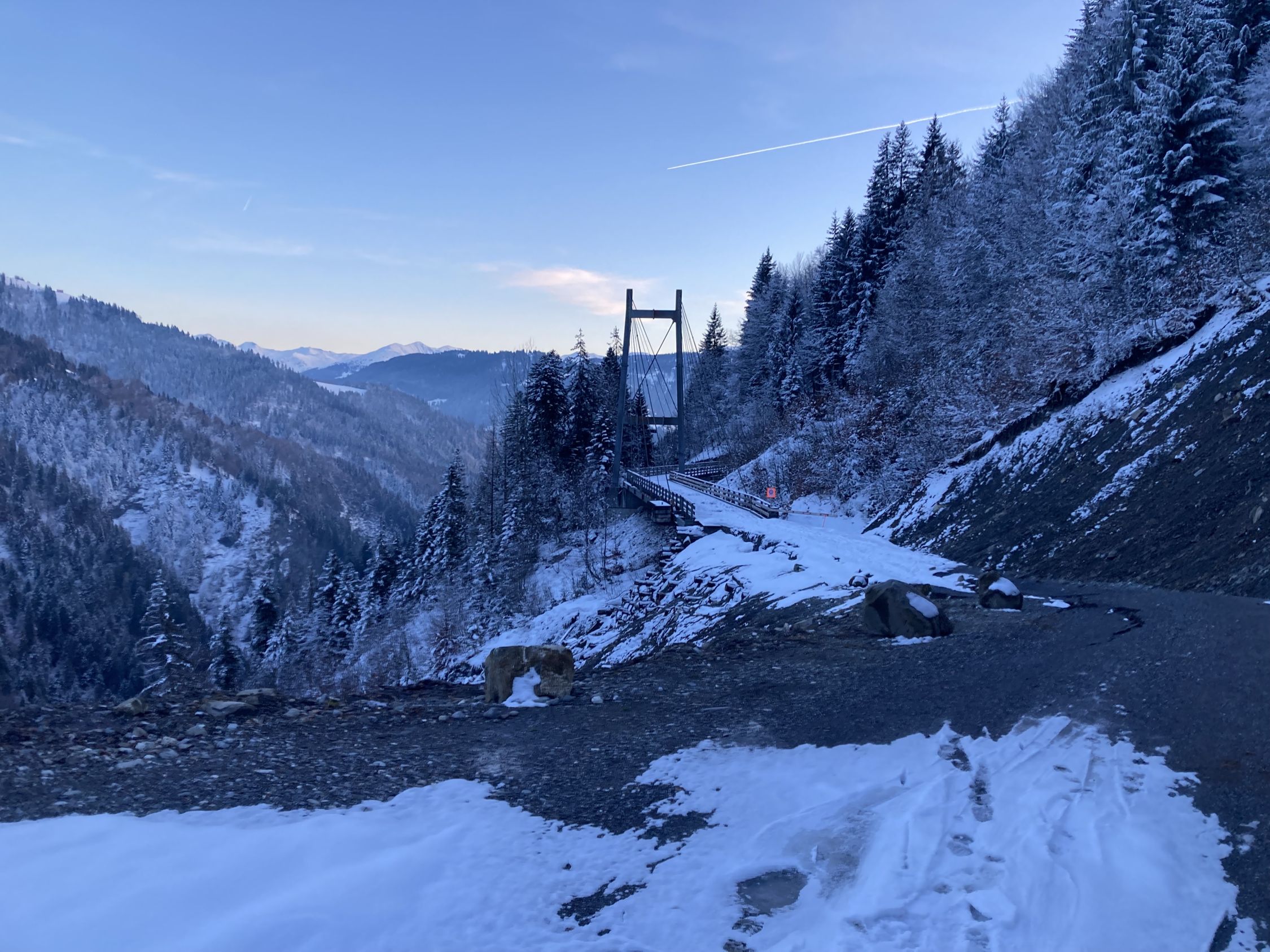 Abfahrt nach Seewis - etwas Abenteuerlich inkl. feuchtfröhliche Bachquerung bei Mattaböda - es hat dort auch eine Brücke diese war für mich aber zu heikel (schmal, schneebedeckt und linker Hand ein Seil als Brüstung welches 30 cm neben der Brücke lief)