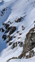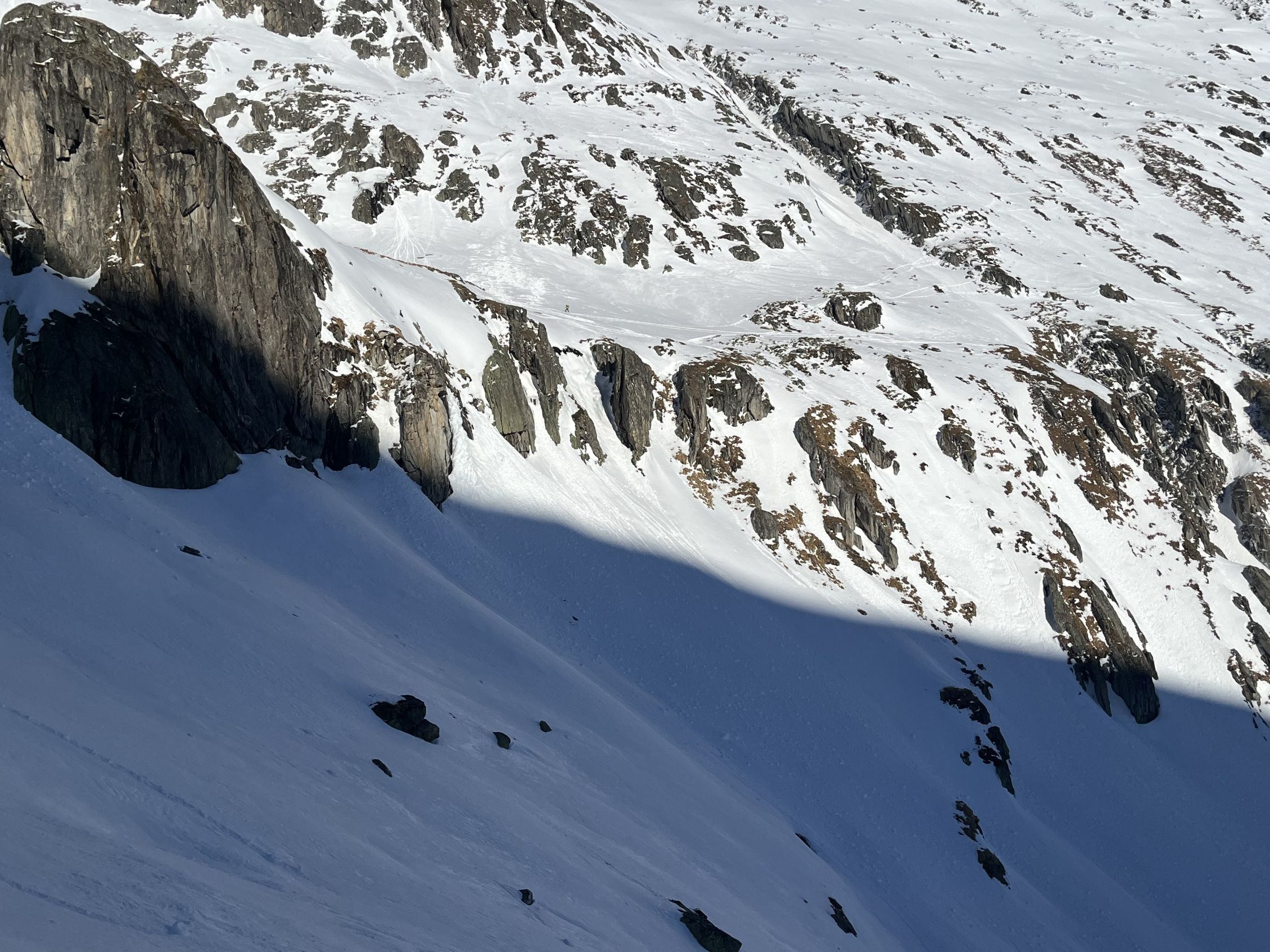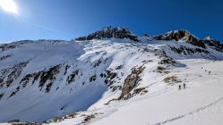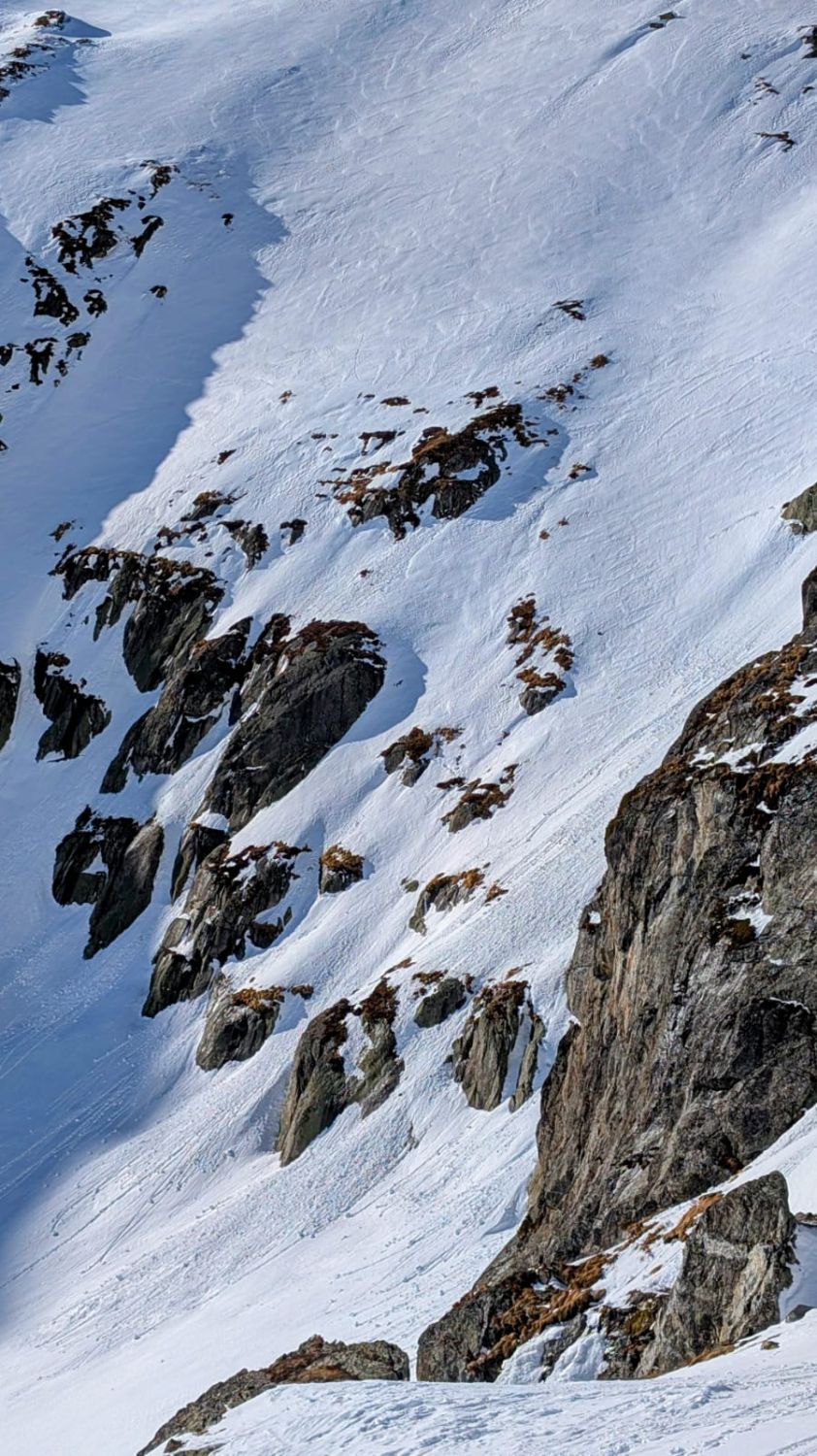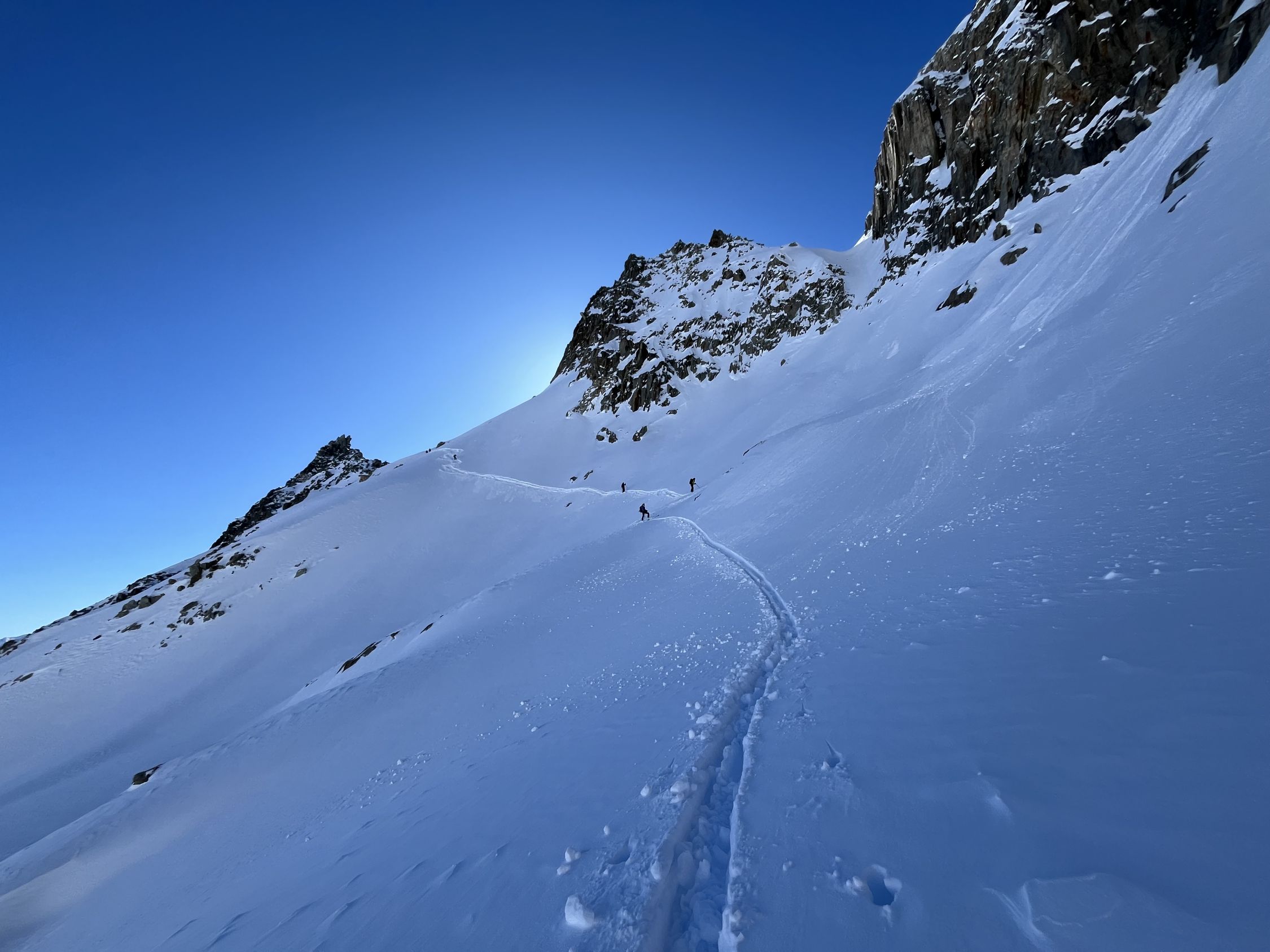 Aufstieg zur Wyssenlücke ist jetzt gespurt; von der Abfahrt durchs Val Val wird dringend abgeraten. Bei der Steilstufe auf ca. 2‘300 m hat es zu wenig Schnee für die Originalroute. Es muss eine riskante, sehr steile Alternative weiter westlich abgerutscht werden.