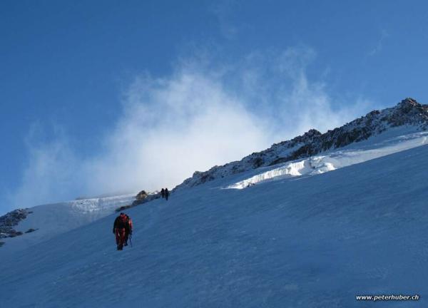 Frühmorgens noch neblig, dann strahlend schön. Um 5 Uhr +5° bei der Tierberglihütte. In der Höhe recht kalt und windig. Oberhalb 3'100 m fror der Schnee und es gab letzte Nacht ganz wenig Neuschnee. (Am Westgrat des Gwächtenhorn mussten sie mit Steigeisen klettern)