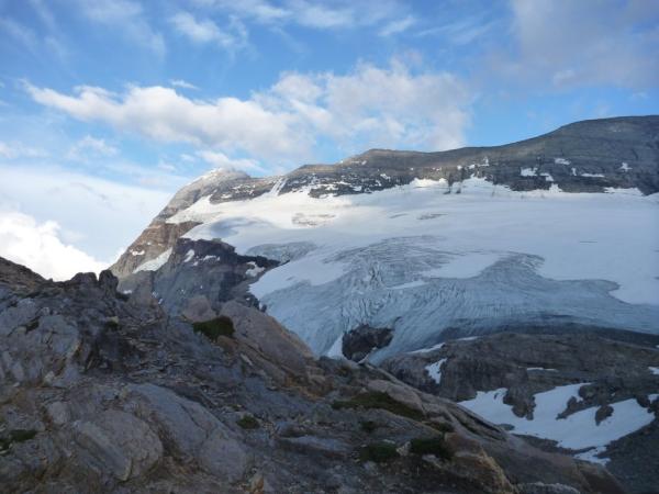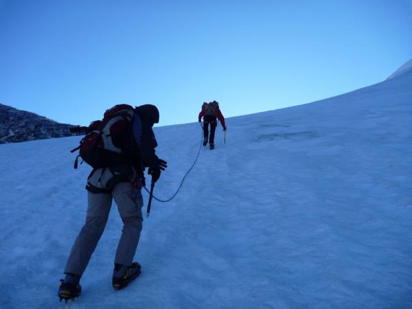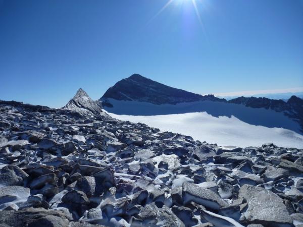 Dank der kalten Nacht optimale Verhältnisse auf den Gletschern. Mittags dann doch weicher, jedoch nur in Ausnahmefällen knietief. Ansonsten wenige Zentimeter. Nordseitig waren die Felsen auf dem Südgrat teilweise mit Wassereis überzogen. Gratzugang mit, Grat selber dann ohne Steigeisen gut machbar. Grat schneefrei. Keine prekäre Spaltensituation.