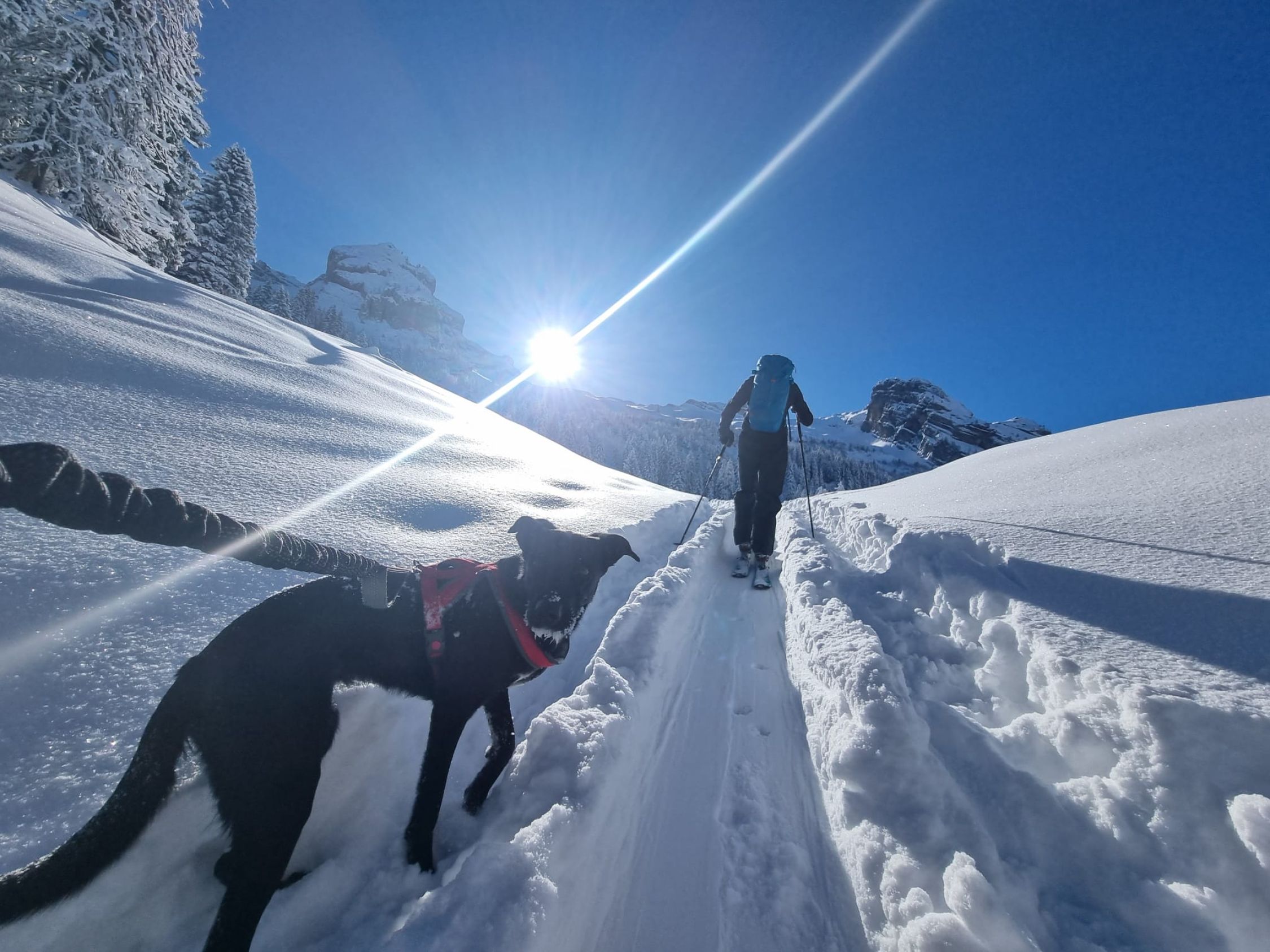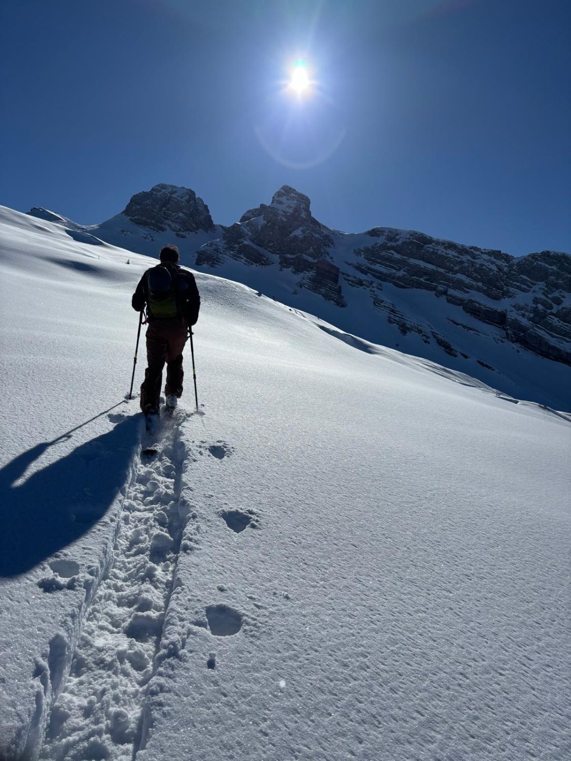 Wochenende +Neuschnee und Sonne vorhergesagt = Parkplatz heiß begehrtes Gut am See. Wir waren um kurz vor 9 vor Ort und hatten noch Glück. Die meisten waren zu dieser Zeit schon los. Im Aufstieg waren wir bis ca 1400hm alleine und ab dann kamen uns die ersten schon wieder entgegen. Ab 1600m war spuren zum Grat angesagt, keine leichte Angelegenheit bei der Neuschneemenge von ca.35-40cm. Auf dem Redertenstock eine Ameisenmenge, ca. 40 Leute und wir ungefähr 1km Luftlinie weiter allein unterwegs.