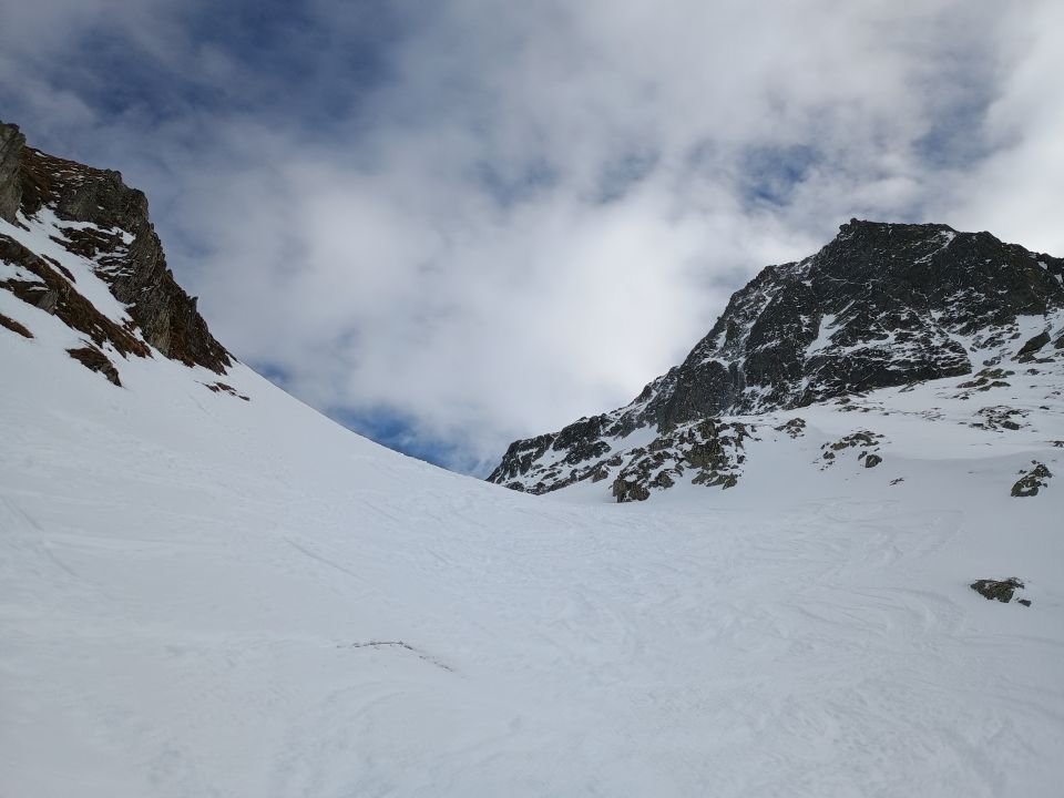 Der Zick-Zack Weg unterhalb P. 1868 und die Querung vor Stavel Veders sind gut machbar, kurz vor Stavel Veders rechts steil hoch, geht besser als grade weiter (sehr abschüssig!). Der Aufstieg durch die Steilstufe unterhalb der Fuorcla da Lavaz geht sehr gut, der Hang ist zudem zerfahren und es liegt zu wenig Schnee für eine ernste Entladung.