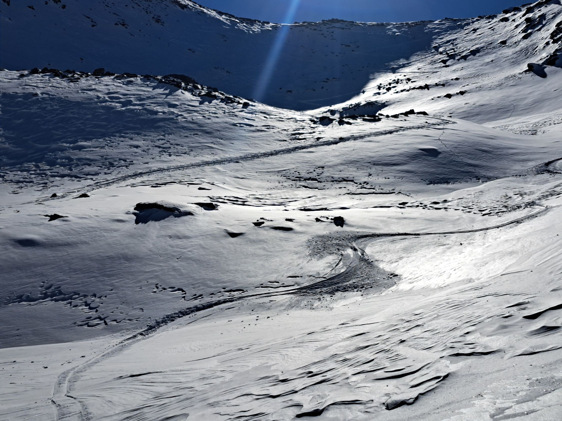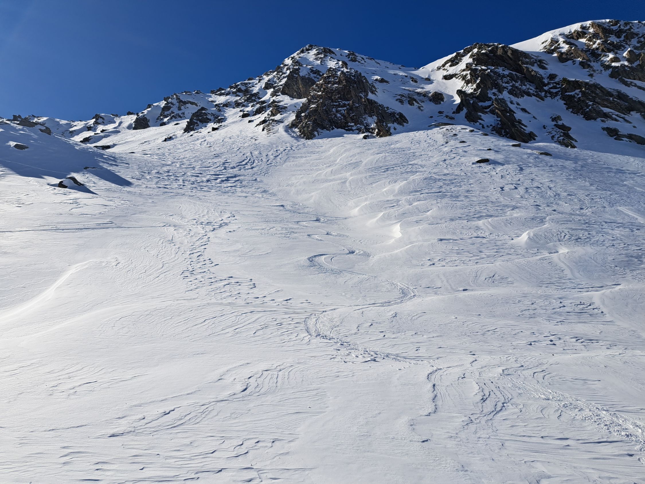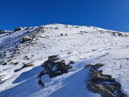 Die Steilstufe ist mit 3-4 Spitzkehren gut zu gehen. Der Gipfelhang abgeblasen. Kann jedoch gut mit den Skies im Aufstieg und Abfahrt gemacht werden.