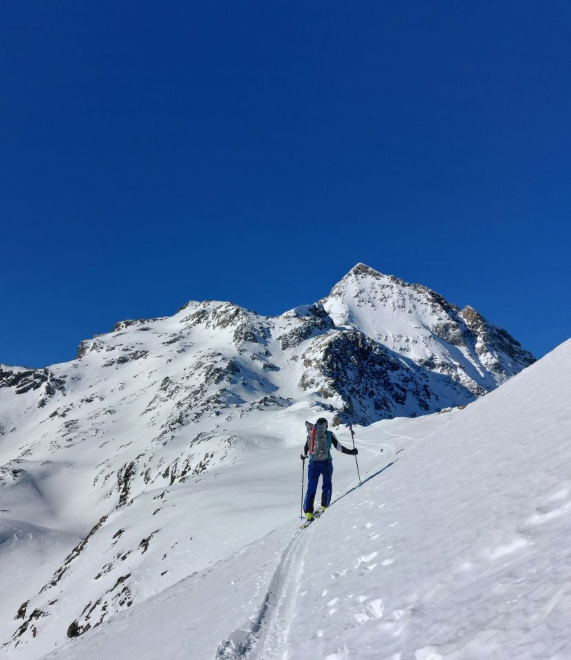 Der Schnee reicht grad, ohne Steinkontakte zurecht zu kommen. Wobei ich einen gröberen hatte... Schneequalität passabel, wobei der Wind seine Arbeit verrichtet hat. Ab Schidepot ohne weitere Aspiranten, bis zum Übergang in die Südflanke gut mit Steigeisen und Pickel zu gehen, dann wird die Schneeauflage knapp, wechselhaft und teils ohne Grundschicht. Ohne Sicherungen im exponierten Gelände heikel. Seil aktuell entsprechend empfehlenswert.