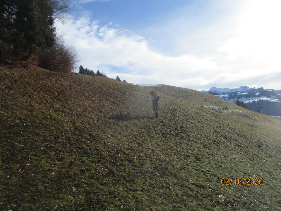 Die beim Aufstieg noch gefrohrenen Wiesenhänge in der schneefreien Zone waren mittags allerdings überaus schmierig und matschig.