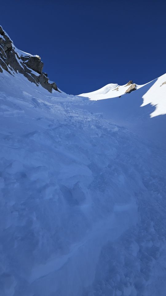 Abfahrt im Couloir N ziemlich guter Schnee, Pulverschnee, der auf den ersten 100 m ziemlich zusammengepresst ist (45° nach C2C, rote Spur). Danach sollte man besser in den Spuren bleiben, da die Platten drohen, sich zu lösen, wenn man sich ausserhalb wagt. Einige versteckte Felsen (man sieht sie jetzt), vor allem im unteren Teil vor dem Plateau.
