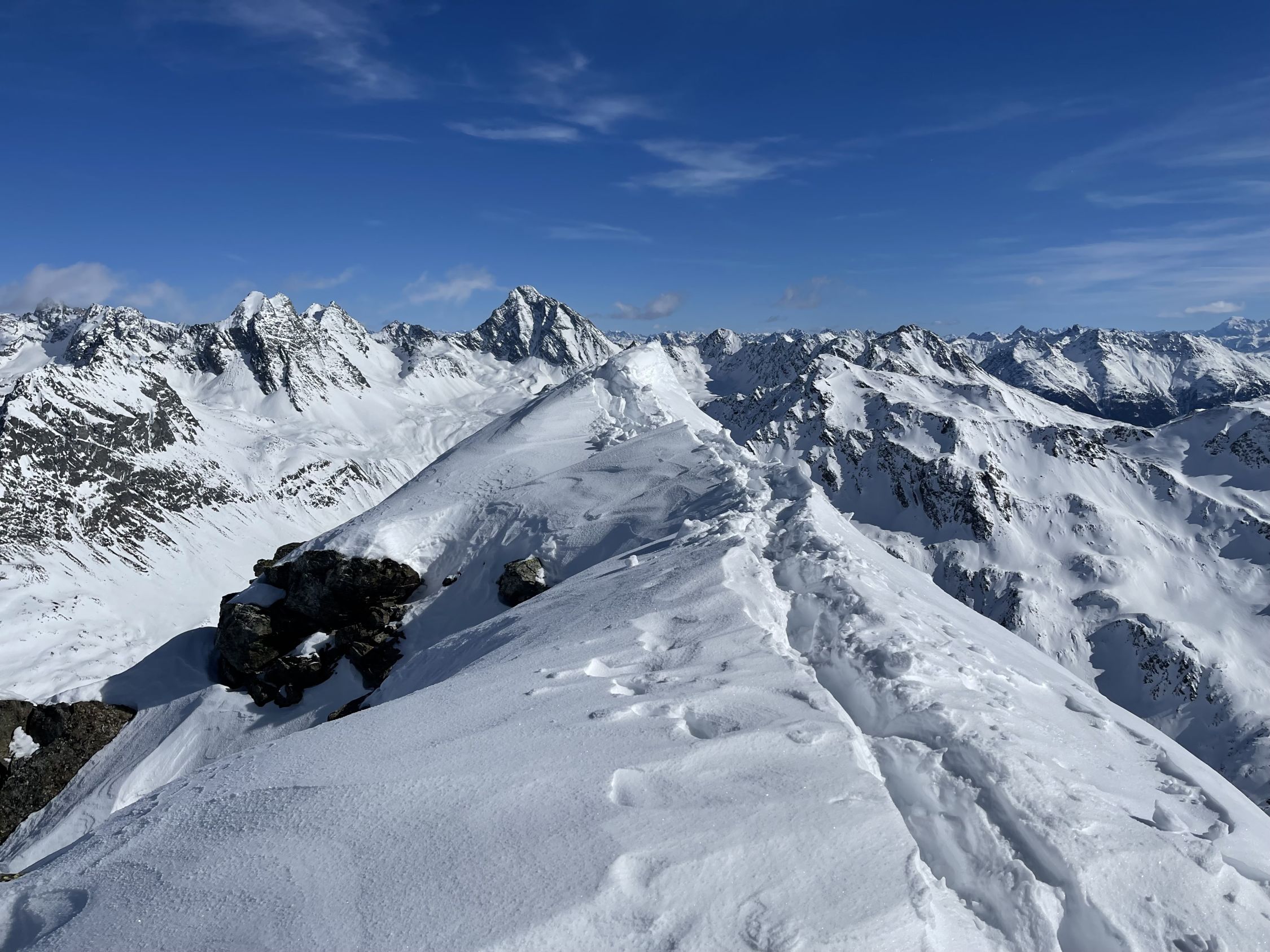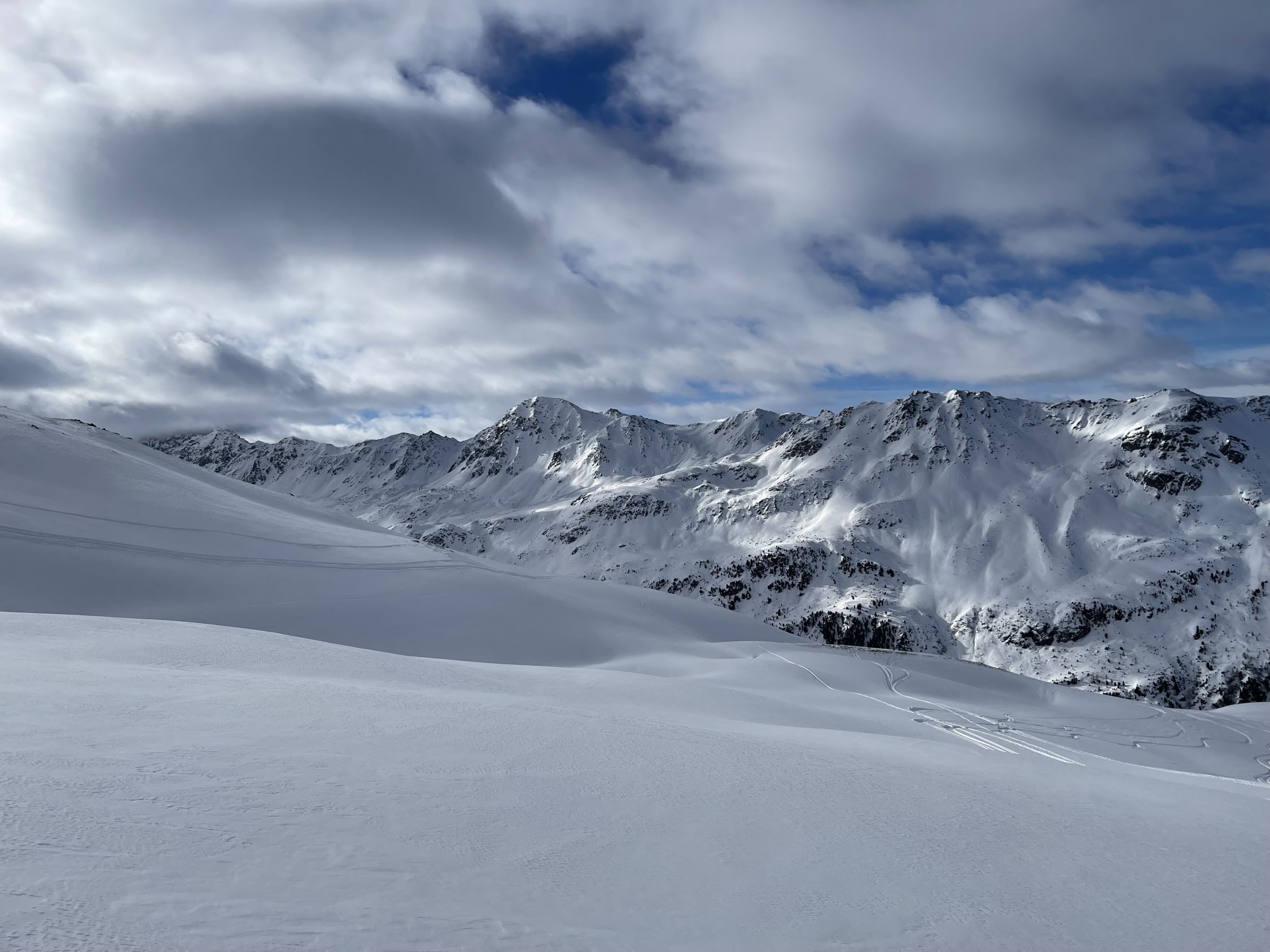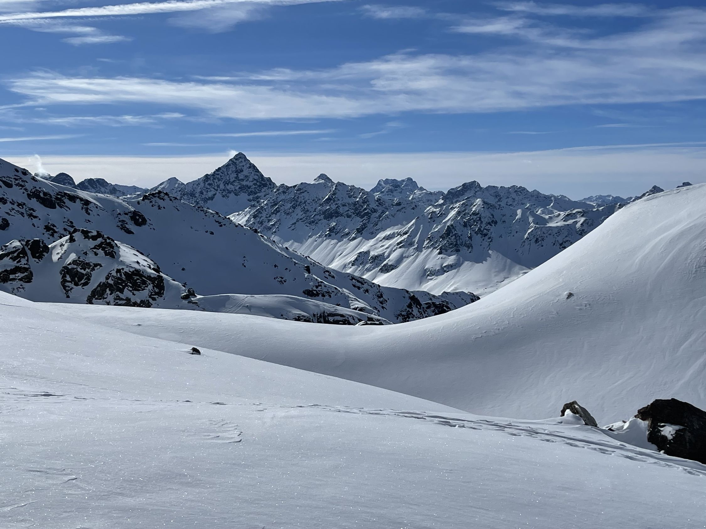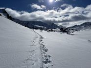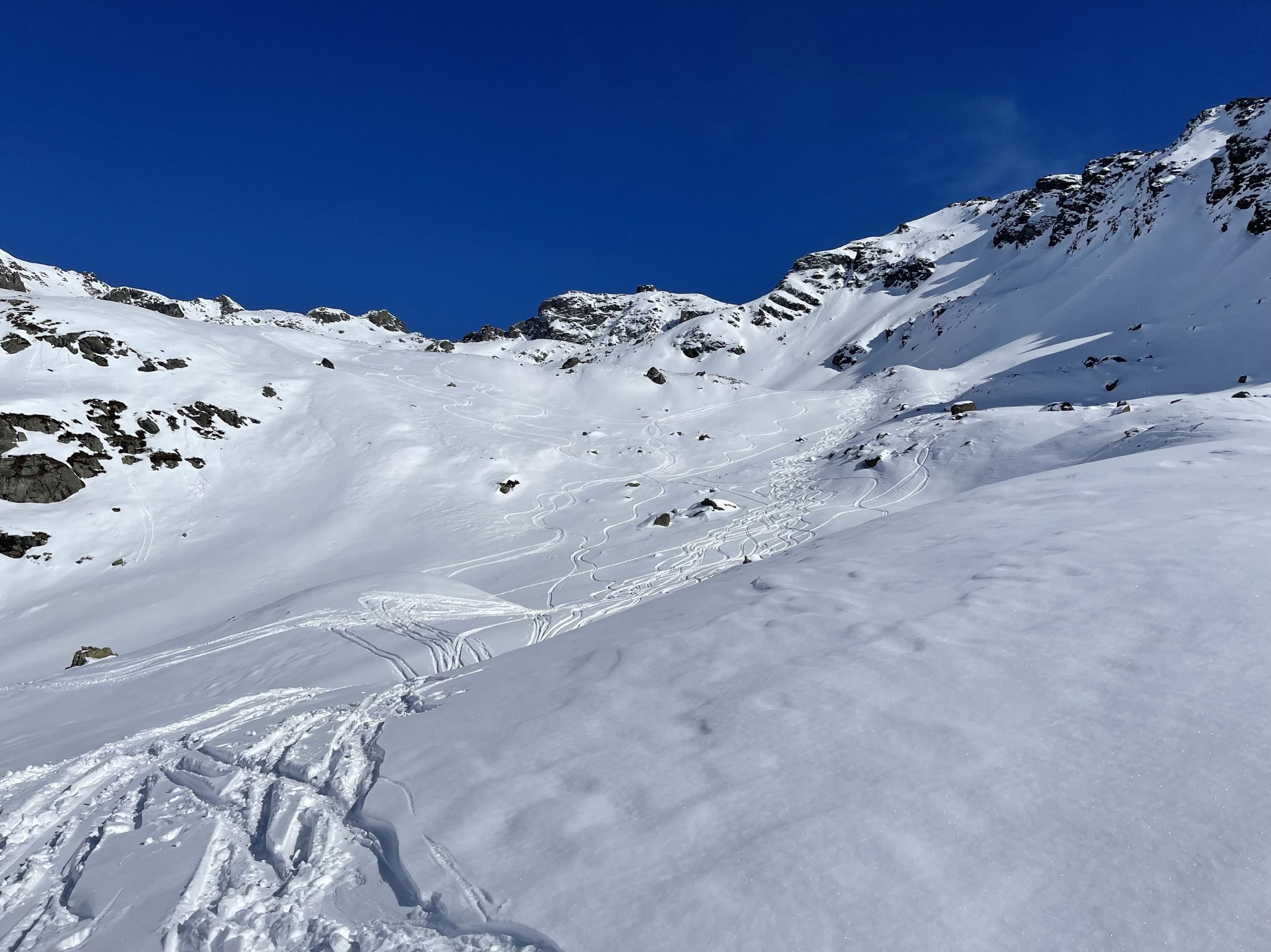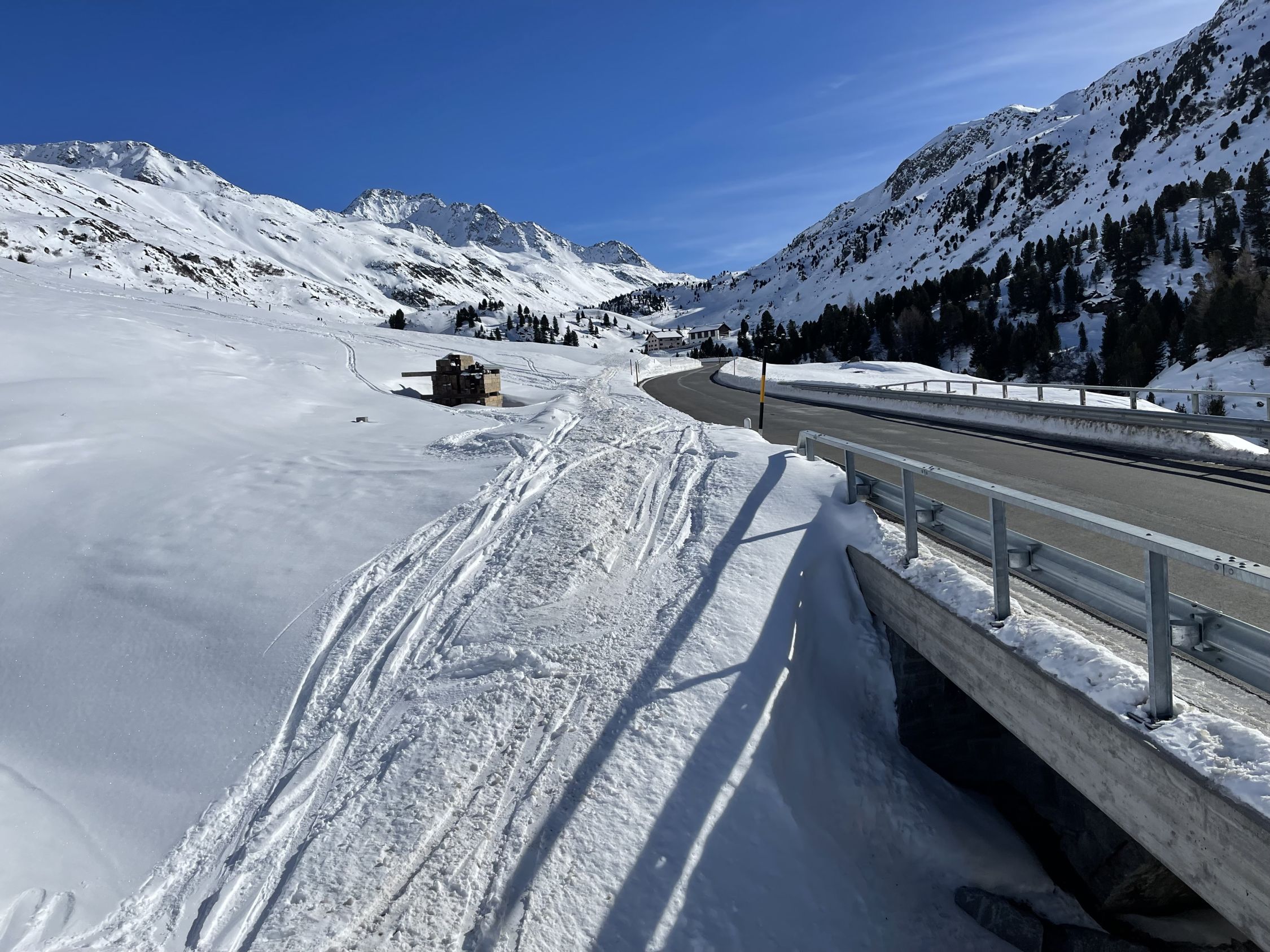 In der Abfahrt immer dem Schatten nach und linkshaltend in schönem Pulver. (Achtung auf Steine). Dann in direkter Linie runter nach Tschuggen und zuerst rechts, später links der Strasse mit einer kleinen Gegensteigung bis zurück zur Talstation.