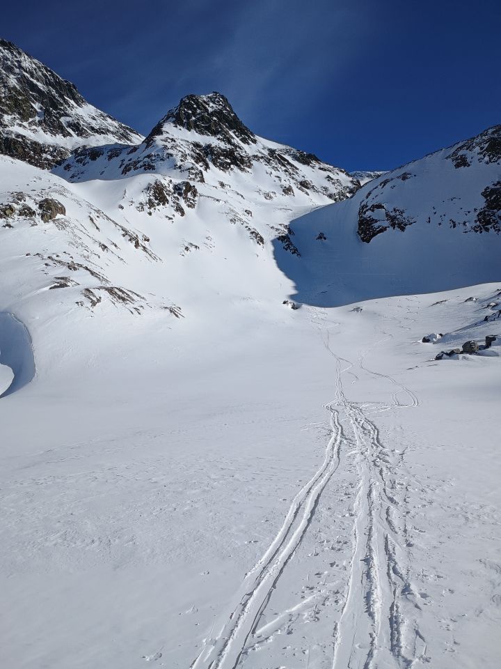Wir haben ca. 100hm unter dem Gipfel Skidepot gemacht, weil es sehr steinig ist. Unsere Ski wollten wir nicht ruinieren... Ging ganz gut, hie und da mal etwas wühlen aber alles in allem tip top. Sind via Couloir oberhalb des Seelein P. 2348 abgefahren, das war sehr fein.