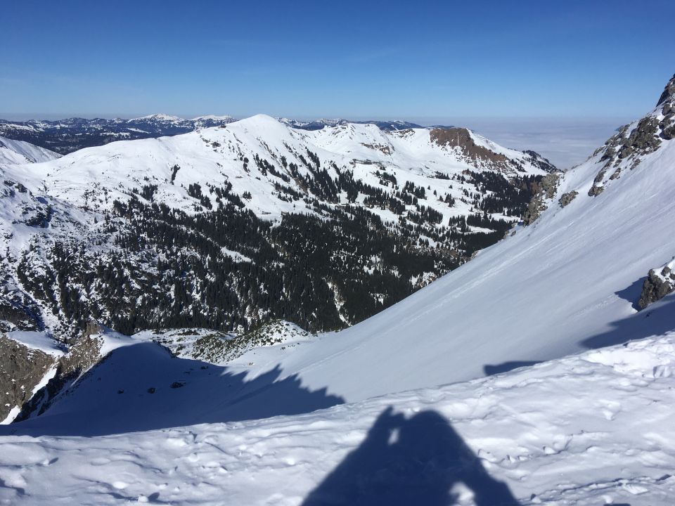 Auf Piste bis auf ca 1200m dann links über Waldpfad (dünne Schnee Auflage, Abfahrt geht nicht!) über Treppen, Stege zum Weg welcher ins Warmatsgund führt. . Dieser ist gut schneebedeckt und eingelaufen. Ab Warmatsgund auf guter Spur in Scharte. Dort umgekehrt. Abfahrt in 20 cm Pulver ansprechend. durch den Busch Gürtel mühsam. Es hat in dieser Höhe noch Steine die leicht überzuckert sind! Obacht!, daher nur gut! Den Weg vor zur Piste ok. Dank der Piste kommt man auf Ski ins Tal, sonst wäre laufen angesagt. Zur Scharte waren von Süden her keine Spuren zu sehen.