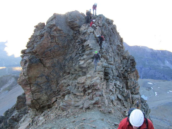 Im Abstieg haben wir beim Punkt 3386 rechts (nördlich) vom Grat bei einer Abseilstelle (Dickes Seil um grossen Felsblock - Zustand überprüfen) abgeseilt und durch eine schuttige Wegspur zum gut erkennbaren Gendarmen zurückgekommen. Über den Gendarmen (siehe erstes Foto unten) und schnell zum Col de Lire Rose zurück.