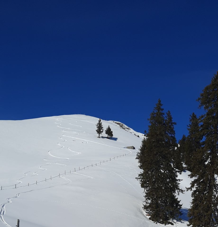Die Verhältnisse wahre Super, in den Mulden und an den Waldränder Super Pulver. Gebiet ist nicht so Verfahren, genügend Schnee, sehr Empfehlenswert, Wetter kippt, neu Beurteilen.