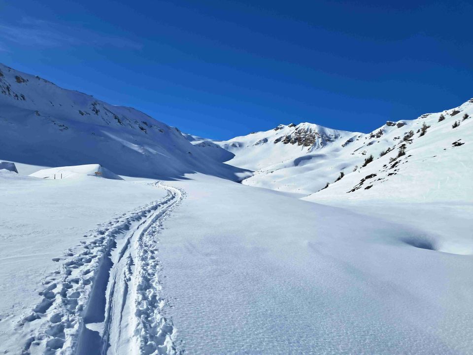 30m unter dem Gipfel kann mit steiler Einfahrt in einen schattigen Pulverhang eingefahren werden. dann noch 8 km Abfahrt zum Parkplatz. Traumhafter Tag.