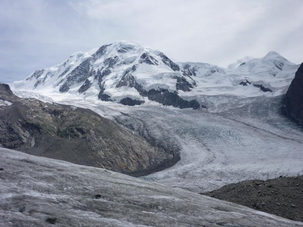 Ab Klein Matterhorn recht strenge Tour. Es empfiehlt sich bis zur Monte Rosa Hütte abzusteigen und dann dem markierten Weg bis Rotenboden zu folgen und NICHT rechts vorbei über die Endlosmoräne zu queren, da unnötiger Zeitverlust und Spass macht das auch nur bedingt. Zeitbedarf mit Spuren und Moränenrumgeier 12,5h. Wers genüsslicher mag, geht von der italienischen Seite aus.