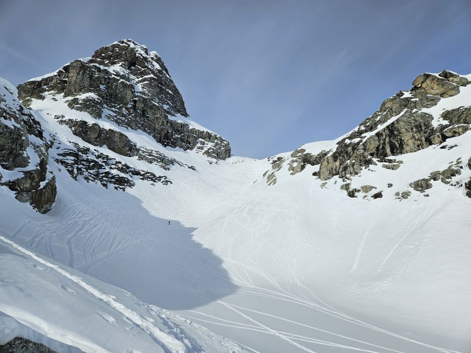 Der Powder bleibt, solange es kalt ist. Sonnseitig wird das bruchharschiger bis Firn.