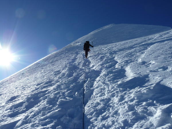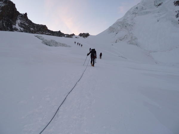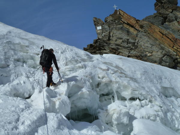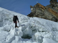 im untersten teil ist der gletscher praktisch aper, noch vor dem festijoch jedoch hat es einige fiese spalten, welche mit dünnen brücken passiert werden können (wie lange noch?).