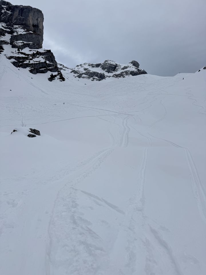 Aufstieg, durch den Wald kaum mehr Schnee, oberhalb der Baumgrenze ausreichend Schnee. Ausfahrt via nord obere 400 top Pulver, danach bremsschnee deluxe. Abfahrt bis Parkplatz problemlos.