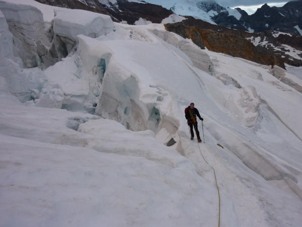 Gletscherlabyrinthe sehr gut zu umgehen, leichter Neuschnee im Aufstieg.