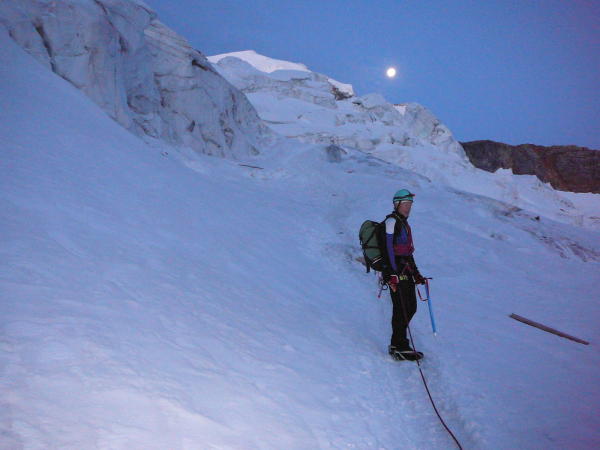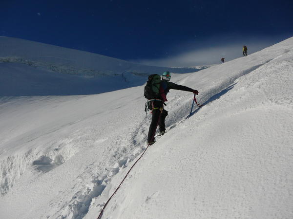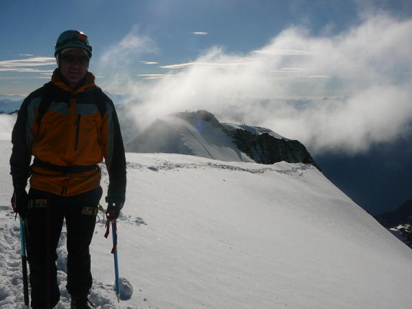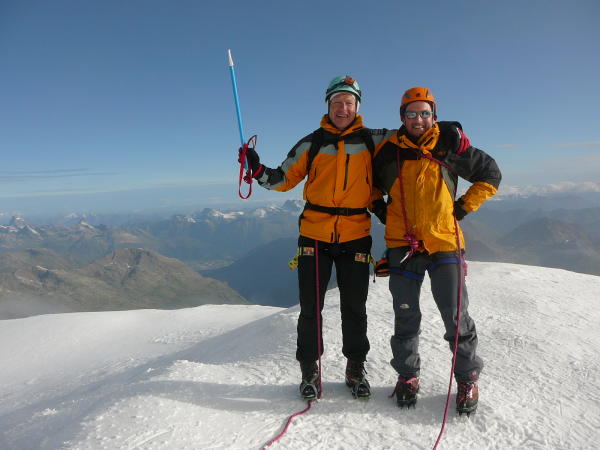 wunderschöner und problemloser Anstieg bis zum Hauptgipfel, vielen Dank an Martin und seine Seilschaft für die tiptop Spur; der Spinas-Grat ist zwar nie richtig schwer, hat uns aber doch einiges an Zeit gekostet. Am Fortezza-Grat kann man einige Abseilstellen besser und zeitsparender abklettern, wenn man das Gelände mag. Hinab zur Isla Persa z.T. schon im tiefen Sulz, auch hier gibt's noch Spalten! Zum Abstieg von der Isla unbedingt den mit großen Steinmännern gut markierten Hauptweg nehmen, alles andere ist ein übles Rumgerutsche. Der weitere Weg auf dem Gletscher und auf dem breiten Weg zum Bahnhof Morteratsch ist schön, vor allem schön lang..