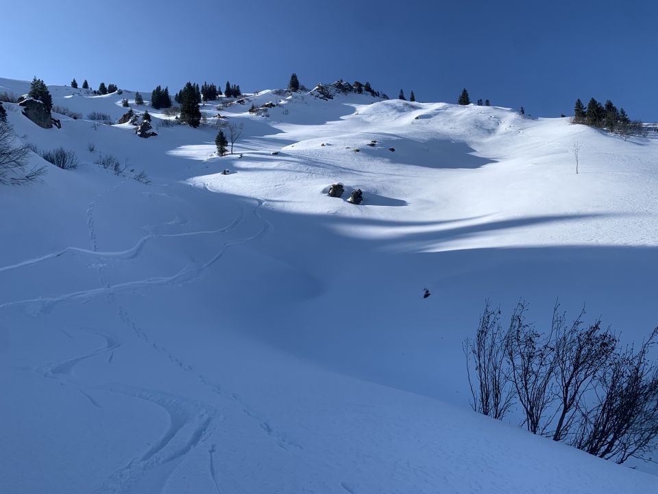 Unten war eine Tragepassage von 200m. Die Ostrinne war open top Pulver, unten raus wurde der Schnee dann auch schon schwerer. Die Nordvariante Richtung Feldalpe war noch ausgezeichnet! Die Standardabfahrt nach Balderschwang runter dann eher unangenehm. Hartes, verspurtes Gelände im Wechsel mit Bremsschnee.