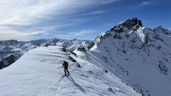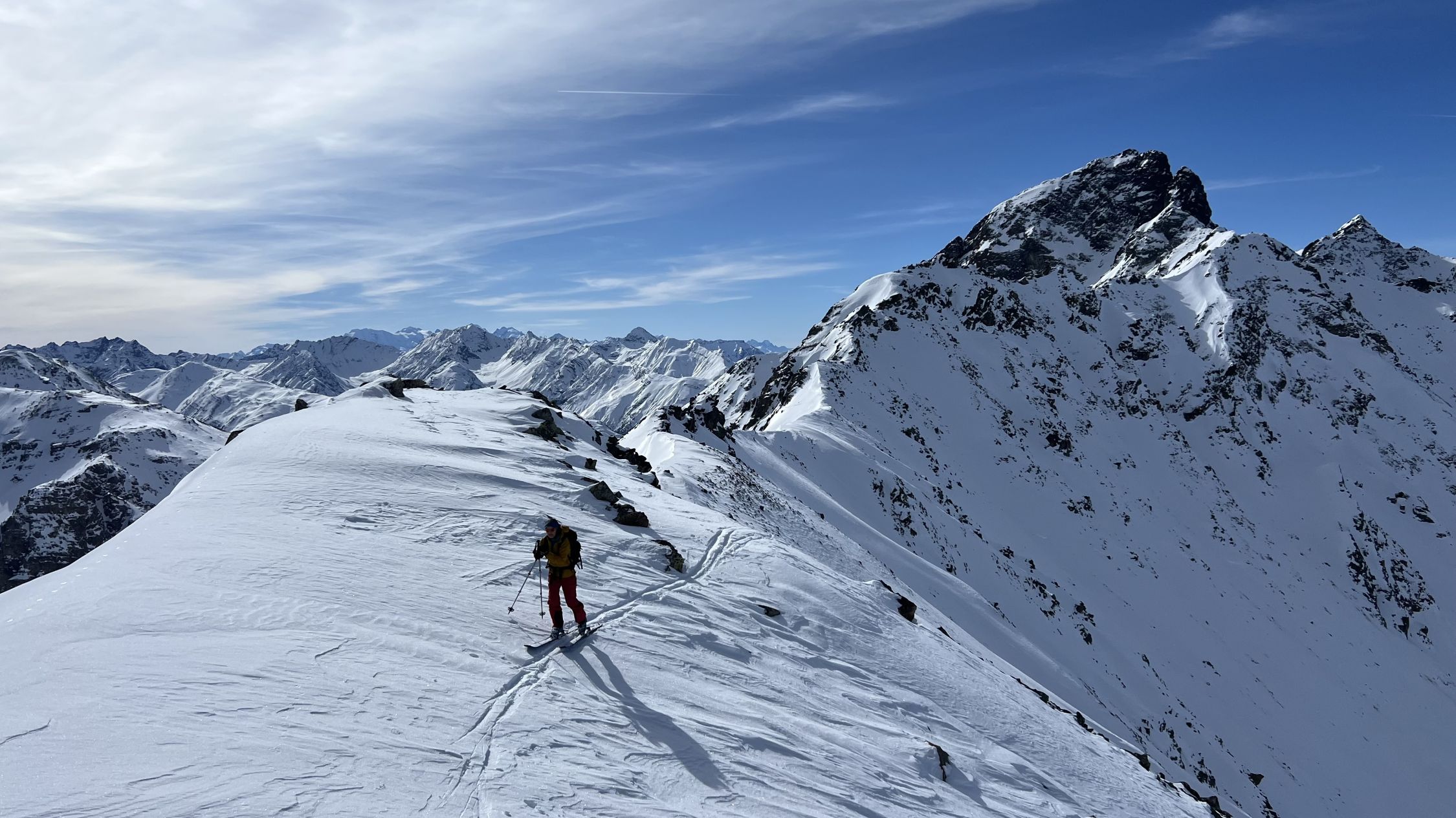 Wir sind von Guarda aus hoch. Auf der ganzen Route hat es ausreichend Schnee. Die letzten 50m bis zum Gipfel zu Fuss.