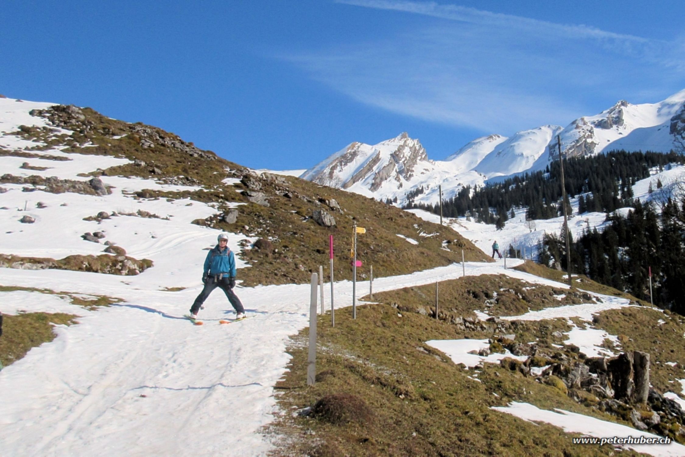 Abfahrt nach Niederrickenbach via Steinalper Jochli. Vom Gipfel bis zum Jochli schon recht zerfahren. In den Südflanken des Zwelfer schöner Feuchtschnee, gut zu fahren. Bei den Chrüzhütten eher mühsam, leichter Bruchharsch. Auf der schneebedeckten Strasse bis Ahorn. Von da einige Male Ski tragen. Zirka 20 Minuten zu Fuss nach Niederrickenbach.