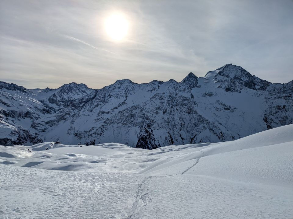 Ab der Bahn zu Fuss zum See, am Ende des Sees Ski angebracht und über die Wiese zum Wanderweg. Im Wald lohnt es sich eher die Ski am Rucksack zu tragen, da der Weg Stufen hat und manchmal aper war, früh am morgen sollte die Kruste noch tragend sein. Weiter zu dem Plato sehr hart, auf dem Plato brüchige Kruste, mühsam zu spuren (jetzt ist aber eine da). Gletscher & der Aufschwung ok. In der Flanke viel loser Schnee, als ich mehrere Meter über der ersten Stahlstange bis zum Bauch im Schnee abrutschte und den Boden berührt habe, habe ich umgedreht. Abfahrt war dann vor der Flanke gut, unter Gletscher etwas Deckel und tiefer (<2300) weich bis sulzig, über den Wald Bremsschnee, Wald muss man tragen, unterhalb isothermisch.