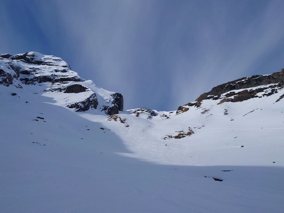 Sehr warm, Gipfelhang wenig Schnee, Abfahrt oben im Schatten noch etwas Pulver, unten teilweise schöner Sulz, teilweise weniger schön